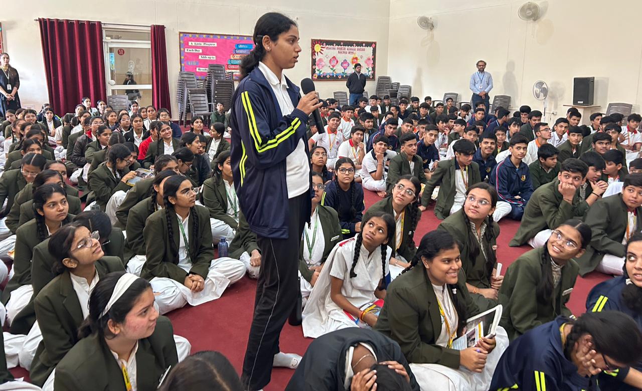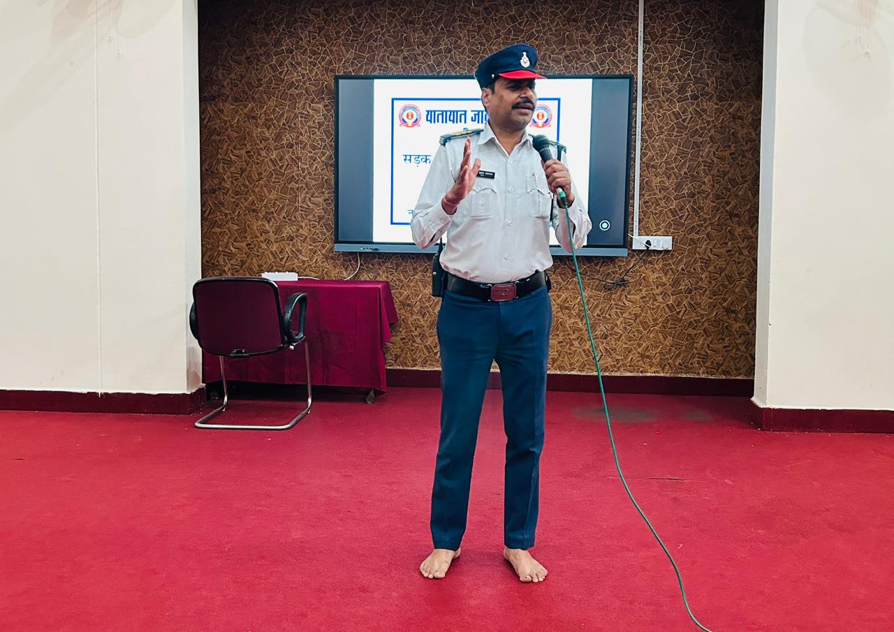 During the session, Shri Saraswat sensitized the students about the importance of following traffic rules and maintaining road discipline to ensure personal and public safety. He highlighted the common causes of road accidents and emphasized responsible behavior as pedestrians, cyclists, and commuters.